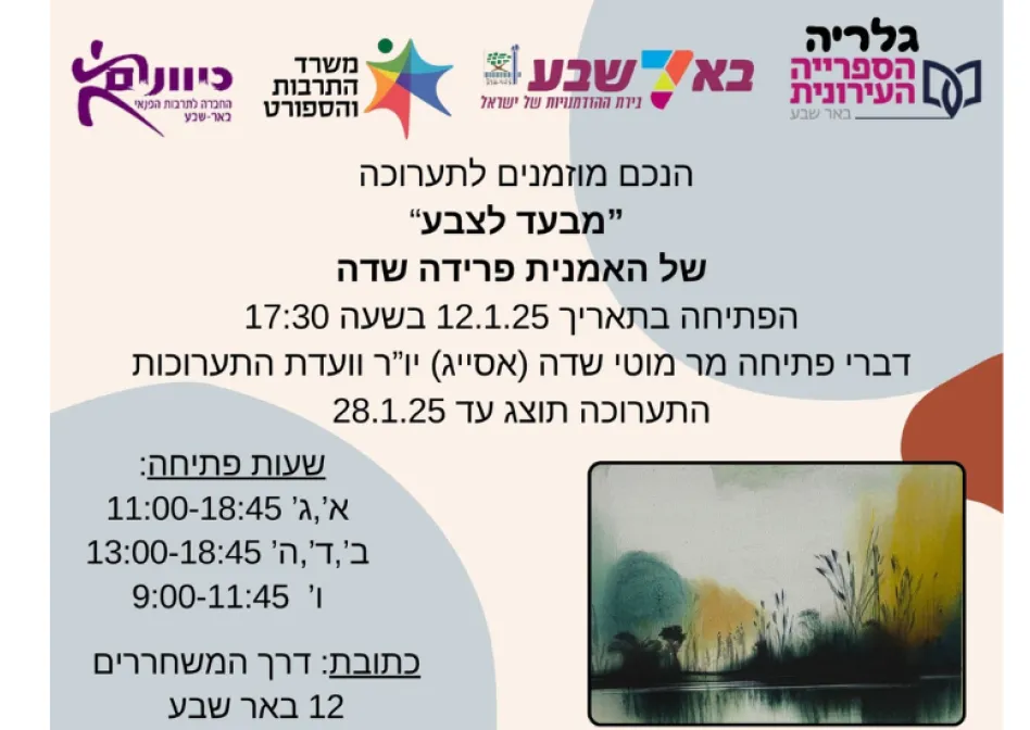 שמחה להזמין אתכם לבקר בתערוכת היחיד שלי "מבעד לצבע" המוצגת בגלריה הספרייה העירונית בבאר שבע.