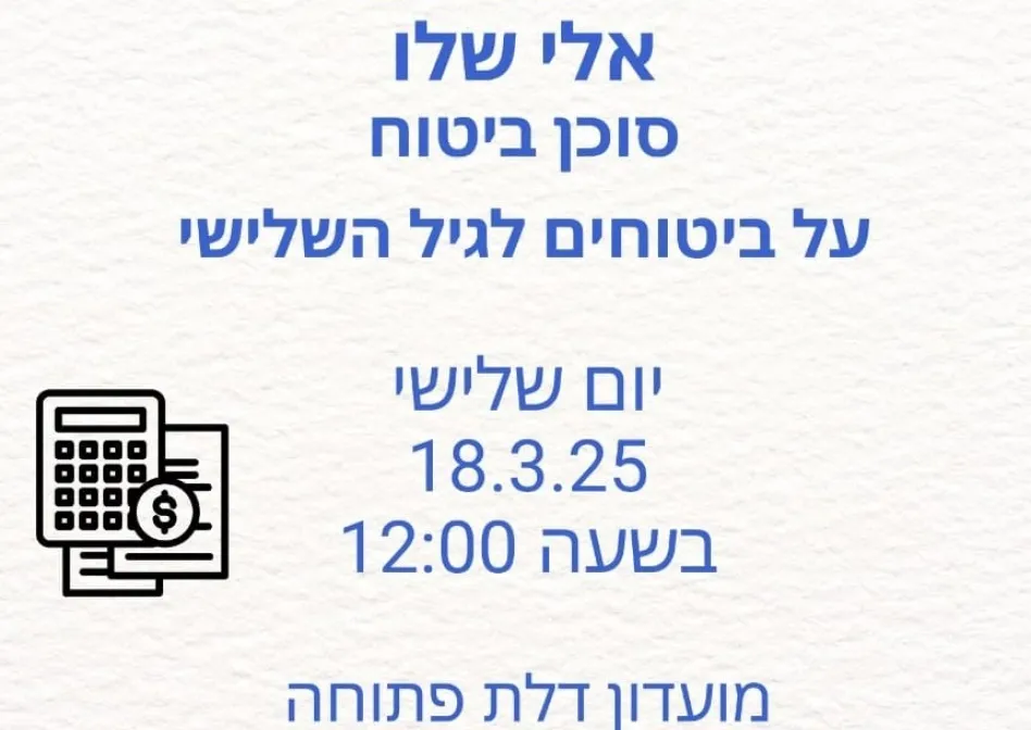 הרצאה פרונטלית לפני בני הגיל השלישי. שם ההרצאה: "עושים סדר ושכל בביטוחים שלנו" (דגש על הגיל השלישי). מועדון "דלת פתוחה" רחביה.