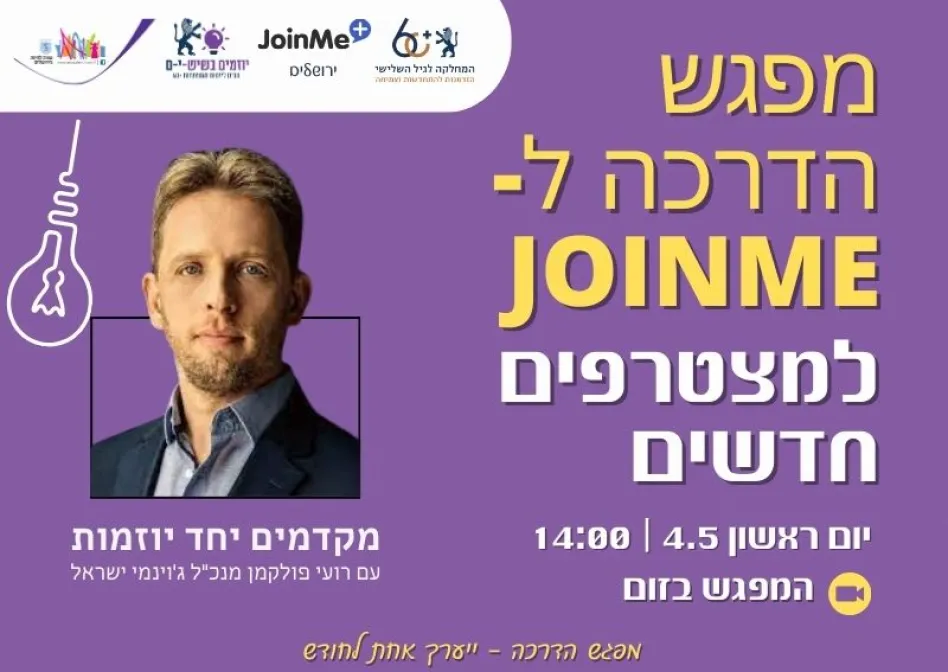 ג'וינמי הינו אתר לפיתוח יזמות של אזרחים ותיקים. הפעילויות באתר הינן ביוזמה של אנשים פרטיים ובאחריותם הבלעדית. אין לרשות המקומית, לארגונים החברים בקהילה או לחברת ג'וינמי אחריות על התכנים או על ההתנהלות בפעילות עצמה" השתתפות בכל פעילות מוצעת הינה על אחריות המשתתף והמארגן בלבד.