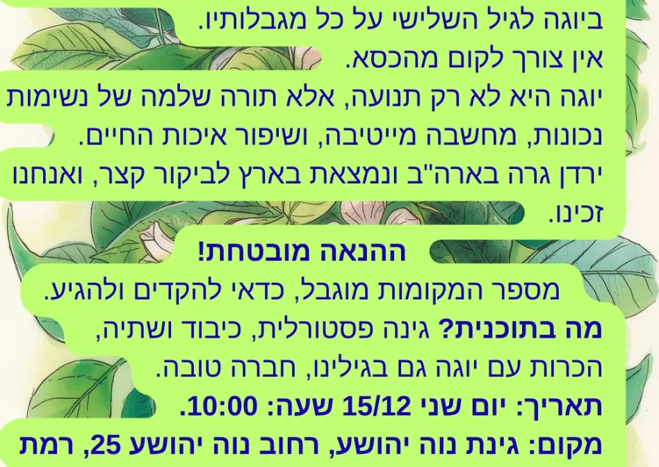 ג'וינמי הינו אתר לפיתוח יזמות של אזרחים ותיקים. הפעילויות באתר הינן ביוזמה של אנשים פרטיים ובאחריותם הבלעדית. אין לרשות המקומית, לארגונים החברים בקהילה או לחברת ג'וינמי אחריות על התכנים או על ההתנהלות בפעילות עצמה" השתתפות בכל פעילות מוצעת הינה על אחריות המשתתף והמארגן בלבד.
