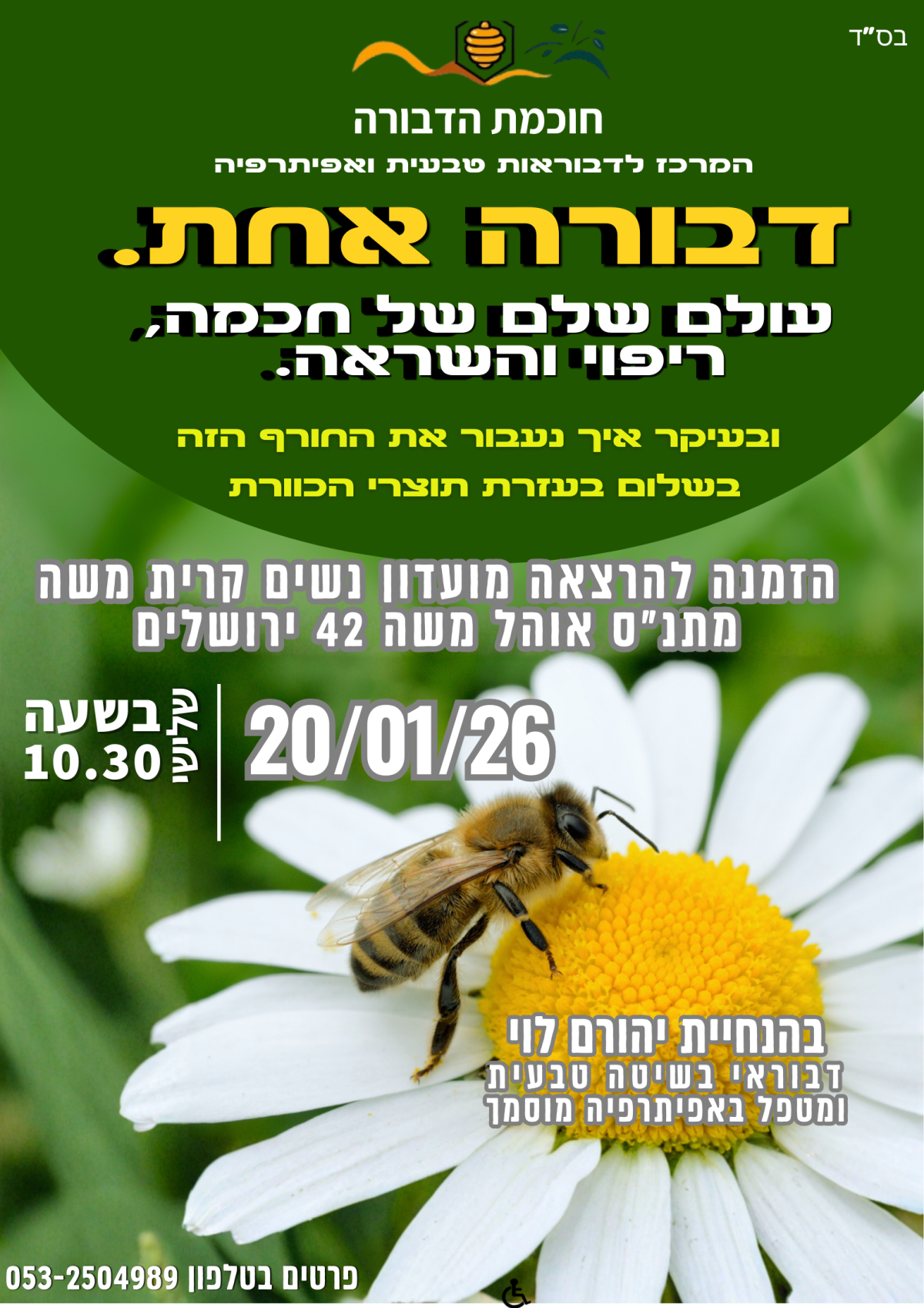 *הרצאה מעצימה על עולמה המופלא של הדבורה ועל סודות הריפוי הטבעיים שבמכוורת.*