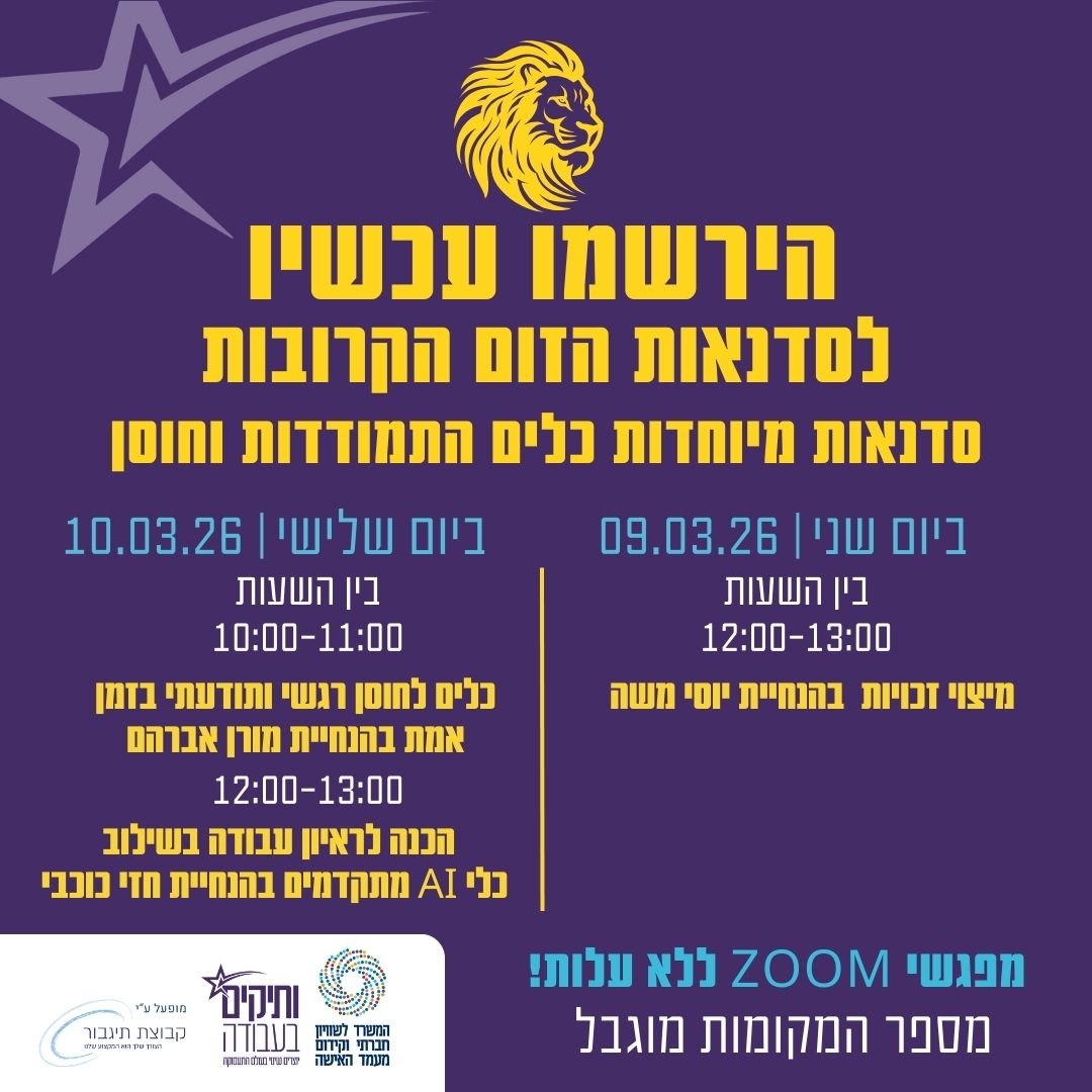 תוכנית ותיקים בעבודה מזמינה אתכם/ן לסדנאות זום מיוחדות, בהן תקבלו כלים פרקטיים להשתלבות בעבודה בתקופה מאתגרת.