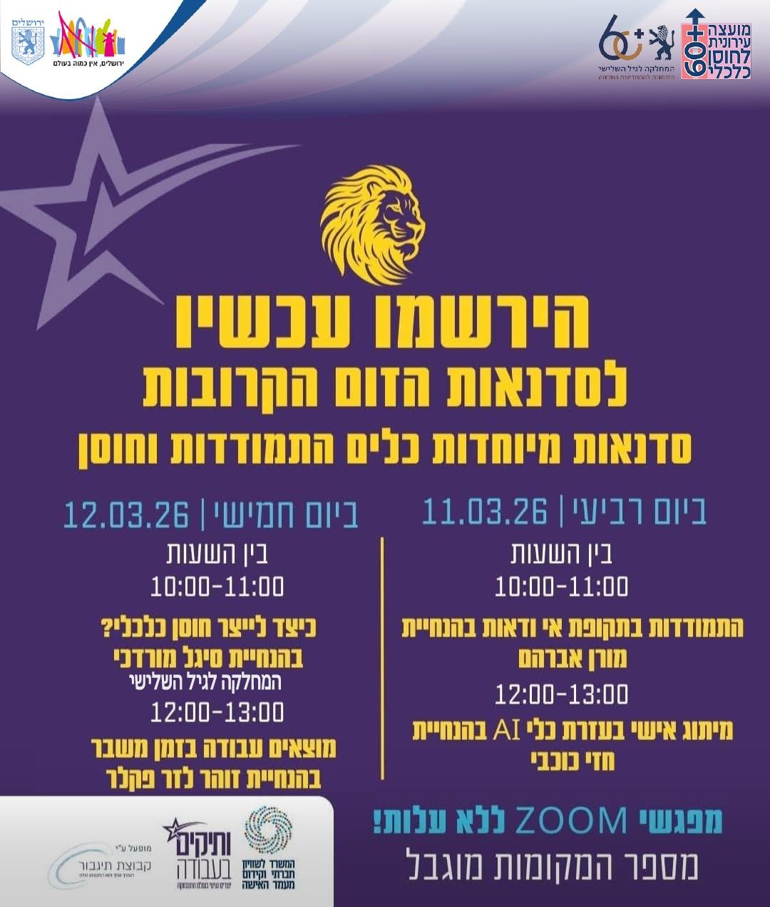 ג'וינמי הינו אתר לפיתוח יזמות של אזרחים ותיקים. הפעילויות באתר הינן ביוזמה של אנשים פרטיים ובאחריותם הבלעדית. אין לרשות המקומית, לארגונים החברים בקהילה או לחברת ג'וינמי אחריות על התכנים או על ההתנהלות בפעילות עצמה" השתתפות בכל פעילות מוצעת הינה על אחריות המשתתף והמארגן בלבד.
