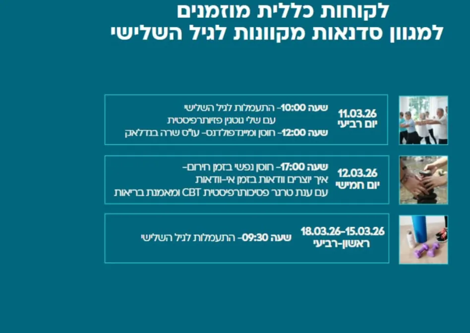 מפגשים עם אנשי מקצוע שייתנו כלים להתמודדות, חיזוק החוסן ,הפגת מתחים ושמירה על כושר גופני – בסביבה תומכת ונגישה.