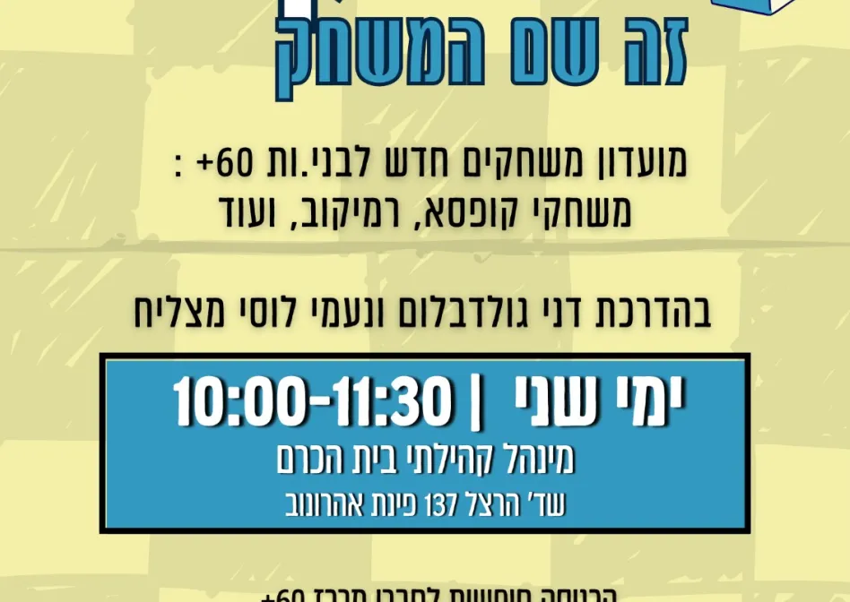 יוזמה- משחקים זה שם המשחק באה לתת מענה לאזרחים ותיקים כמועדון שבועי להרחבת מעגל החברים והפגת הבדידות מחד ומאידך לשמר ולחזק את היכולות הקוגנטיביות והזכרון כיוון שמשחקים עוזרים לתרגל מיומנויות קוגניטיביות חיוניות ולהעצים את חלקי המוח האחראים על יצירת מחשבה וזיכרון מורכבים כיוון שמחקרים מראים שלמידה של משחקים חדשים מפעילה אזורים אחרים במוח ובכך תורמת לשמירה עליו ומפחיתה את הסיכון לירידה קוגניטיבית, הקשורה לדמנציה ואלצהיימר.